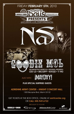 Hip-hop veterans Nas and Goodie Mob stormed the stage of the Knight Concert Hall at the Adrienne Arsht Center in downtown Miami late Friday with a performance that was light on production value, but heavy on crowd-pleasing rap classics.